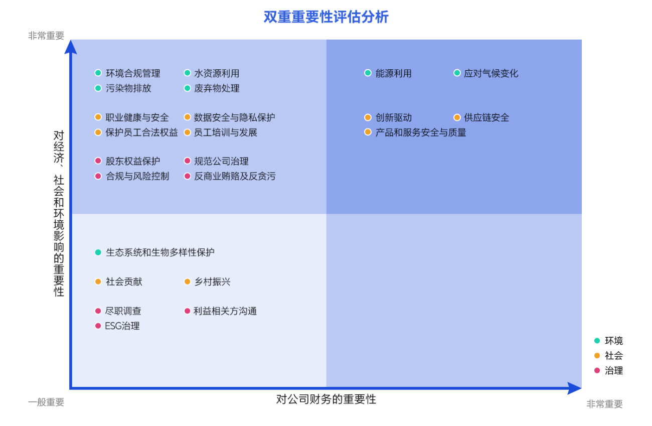 我們定期根據(jù)行業(yè)對(duì)標(biāo)分析結(jié)果,結(jié)合利益相關(guān)方回收的問(wèn)卷,從“影響重要性”與“財(cái)務(wù)重要性”兩個(gè)維度進(jìn)行識(shí)別,形成重要性議題矩陣。